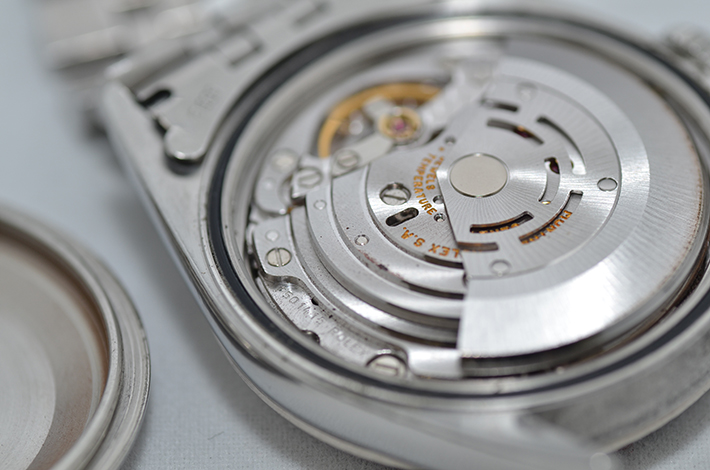 写真でもご覧いただける通り、パっと見でも分かるほどリューズの一部が大きく破損していました。ケース全体にも細かな傷が目立ち、内部にもかなり汚れが付着した状態。このため、今回はリューズ部品交換と共に、分解掃除(オーバーホール)、ローター真交換、バネ棒交換、ケース&ブレスの外装仕上げを実施しました。