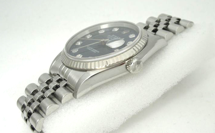 インデックスに大きなダイアを配した高級ロレックス。大きく破損したリューズ交換と分解洗浄、外装仕上げを施しました。