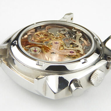 写真でもご覧いただける通り、パっと見でも分かるほどリューズの一部が大きく破損していました。ケース全体にも細かな傷が目立ち、内部にもかなり汚れが付着した状態。このため、今回はリューズ部品交換と共に、分解掃除(オーバーホール)、ローター真交換、バネ棒交換、ケース&ブレスの外装仕上げを実施しました。