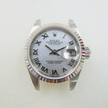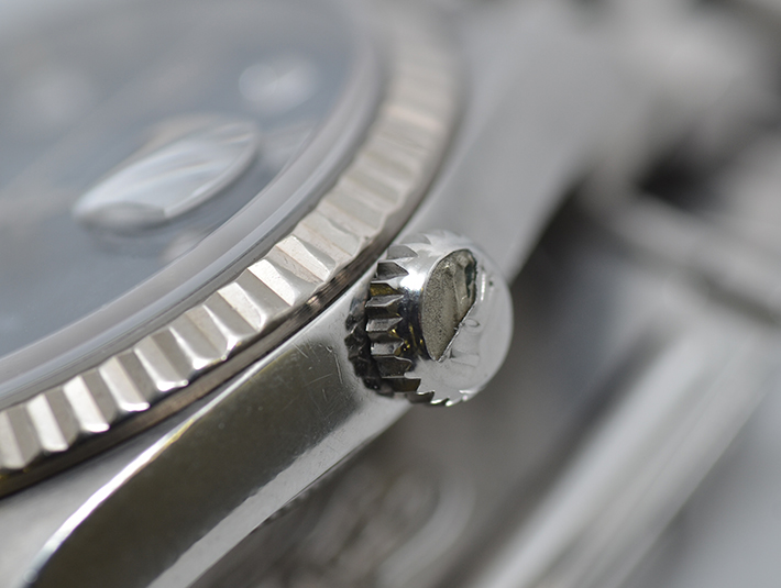 インデックスに大きなダイアを配した高級ロレックス。大きく破損したリューズ交換と分解洗浄、外装仕上げを施しました。