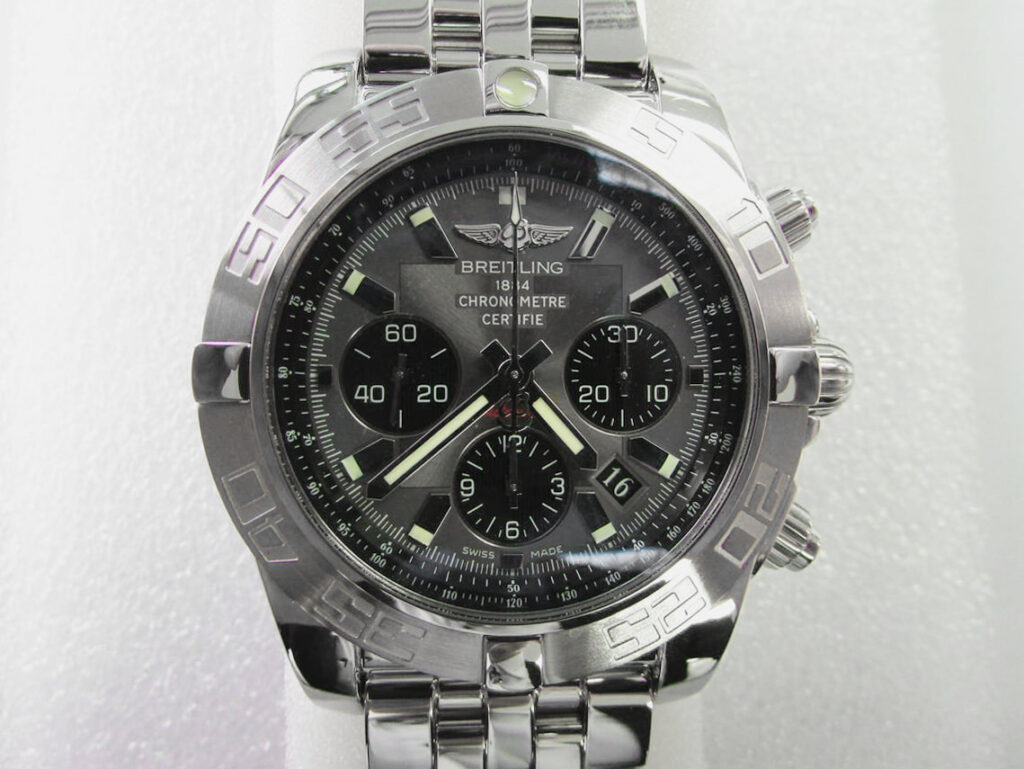 ブライトリングを代表するクロノグラフモデル『クロノマット』シリーズは、ブライトリングの自動巻クロノグラフの代名詞として、高い意匠性と機能性を両立した人気モデルです。今回実例としてご紹介するクロノマットは、ブラック文字盤にバーインデックスを配した国内人気モデル『CHRONOMAT 44 BLACK』。
