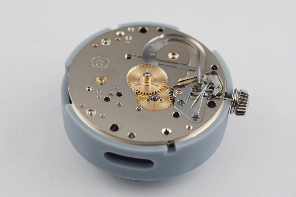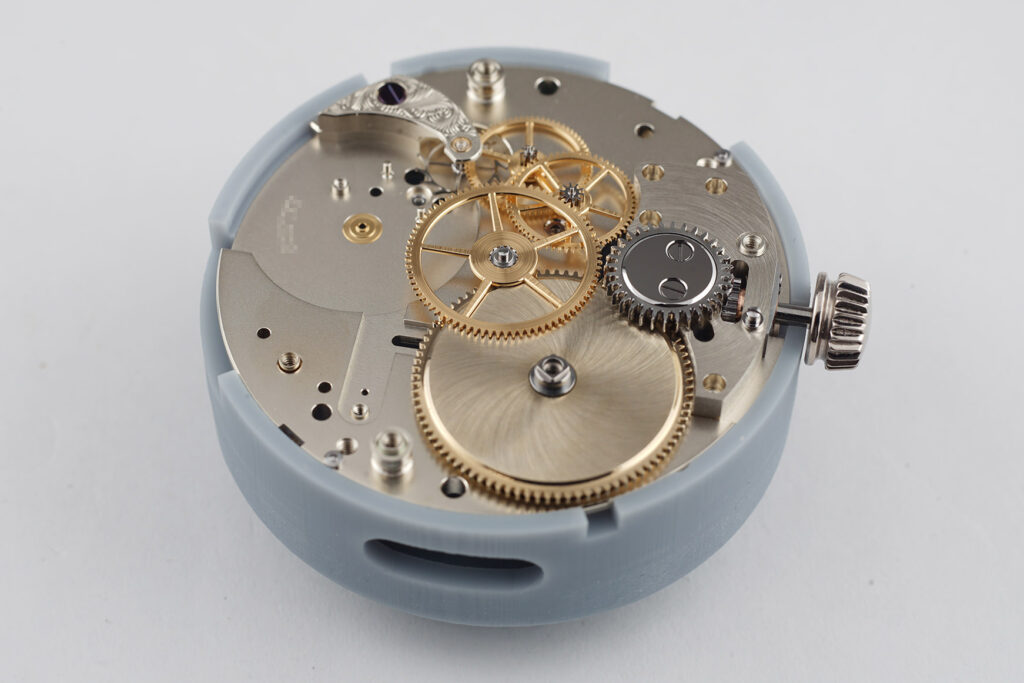 洗浄によってムーブメントは古いオイルや汚れから解放され、本来の輝きを取り戻しました。分解と組み立ては、専用のムーブメントホルダーを用い、細心の注意を払いながら行います。