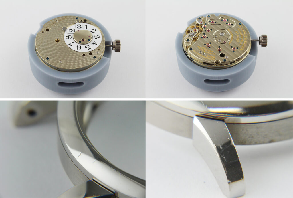 長年のご使用により内部潤滑オイルの減少が見られ、ムーブメント全体には経年による変色が確認されました。また、ケース外装には深い打痕や擦り傷がが生じておりましたので、機能面・外観面ともにメンテナンスを実施いたしました。